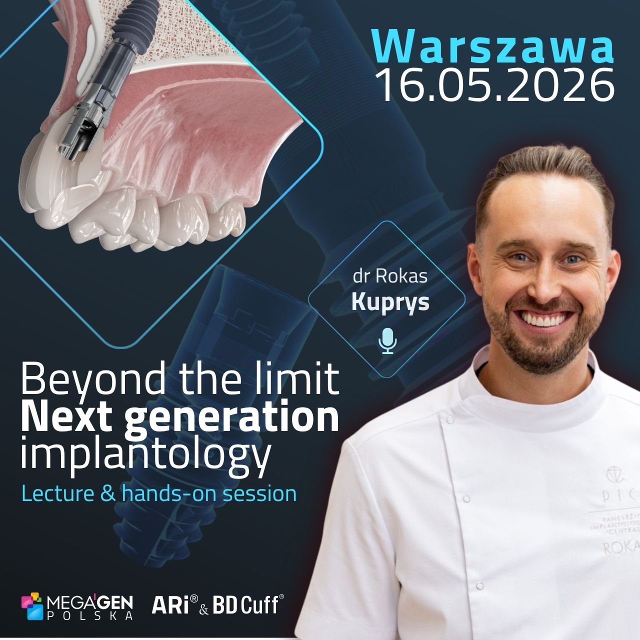 Szkolenie poświęcone nowym systemom implantologicznym ARi oraz BD Cuff. Program obejmuje część teoretyczną opartą na aktualnych protokołach klinicznych oraz warsztaty praktyczne dla uczestników.